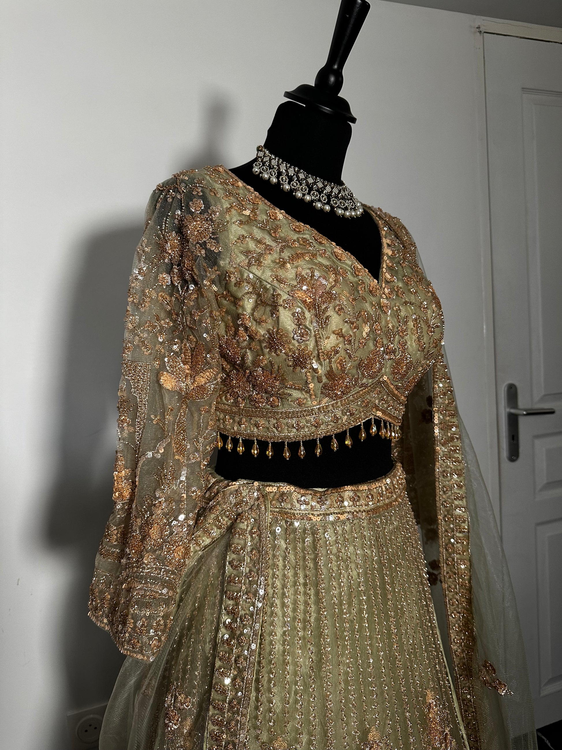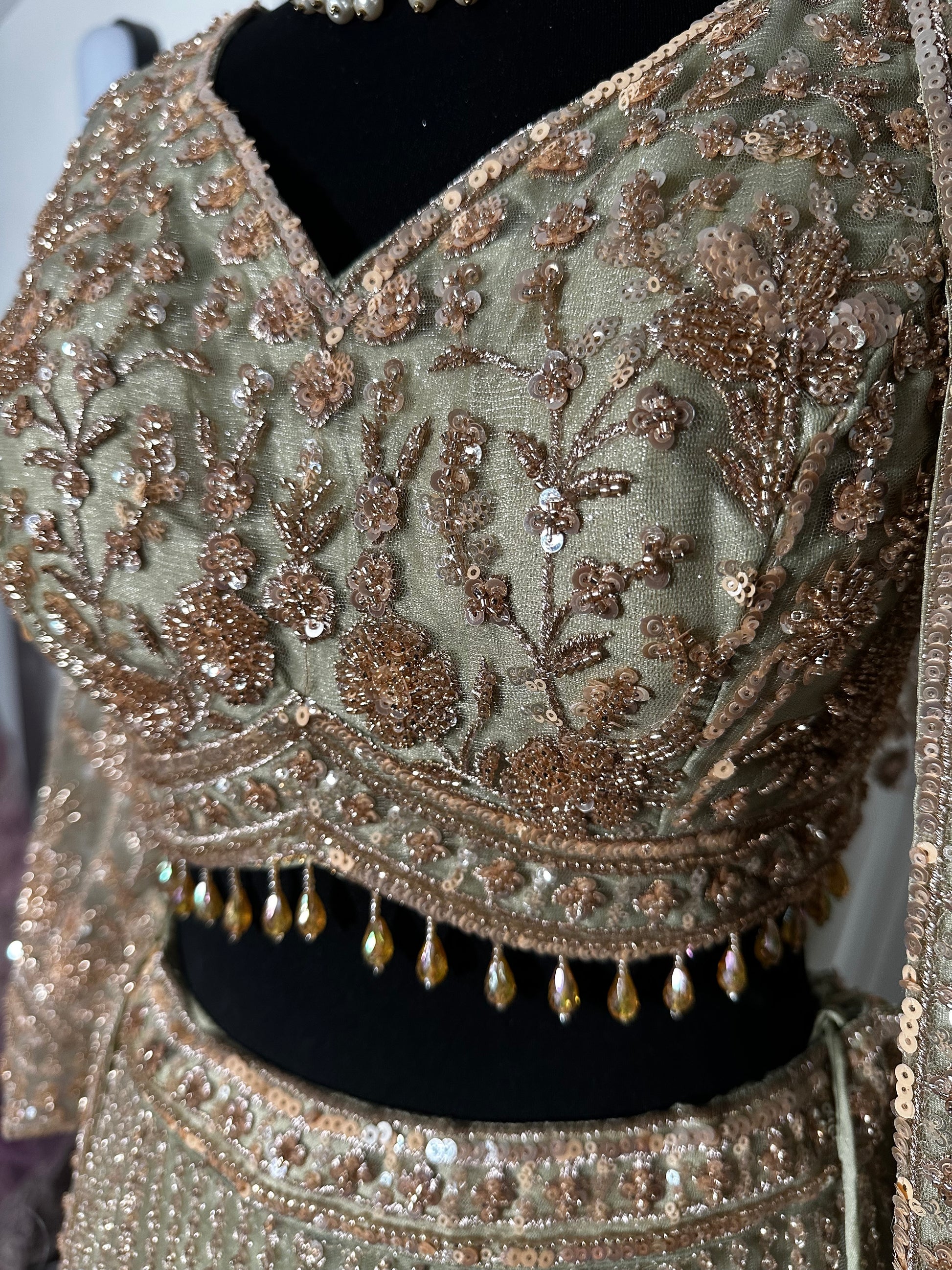 Bas du choli orné d’une bordure perlée à pampilles goutte iridescentes dorées, ajoutant du mouvement et de la brillance à chaque geste.