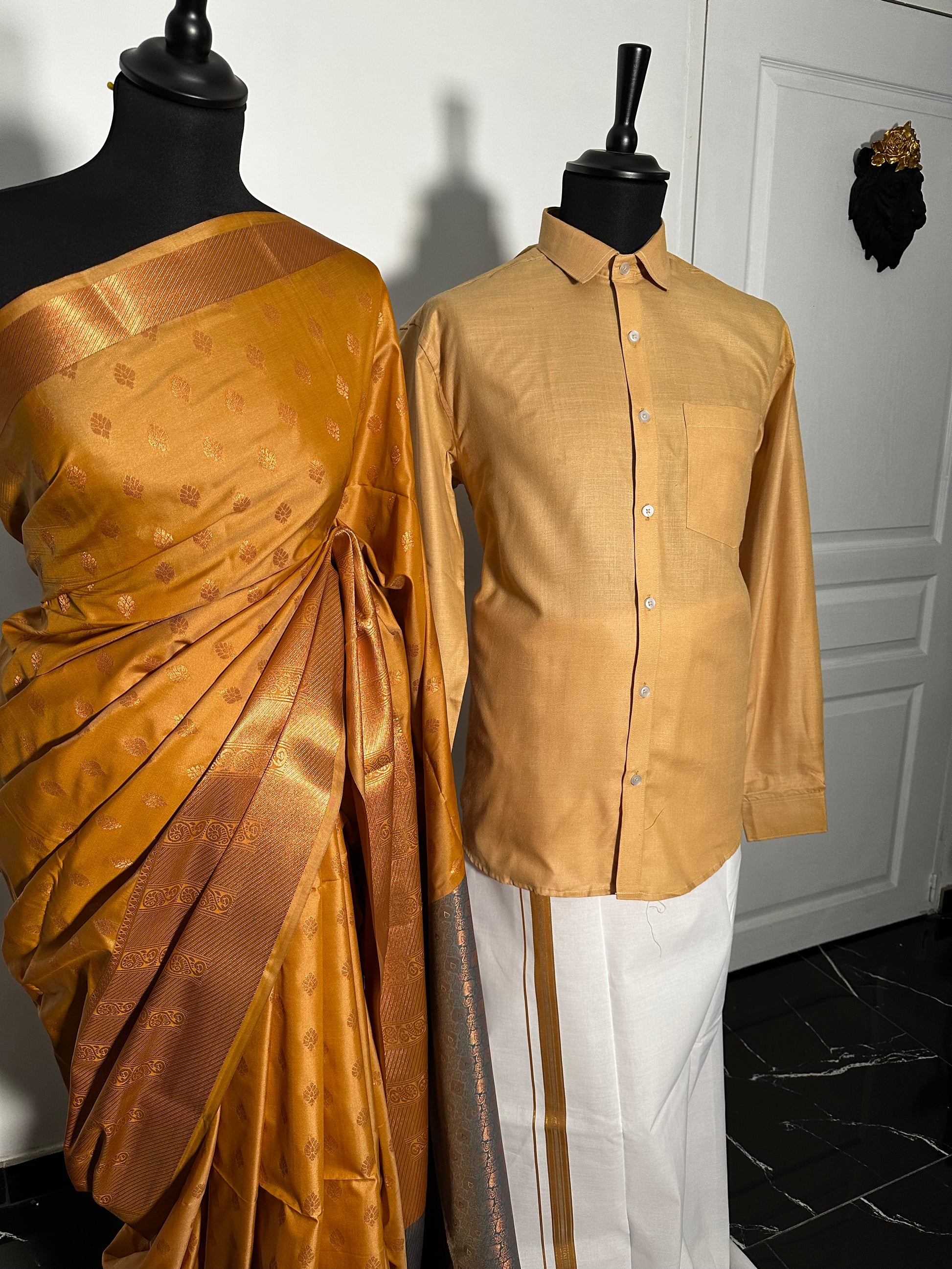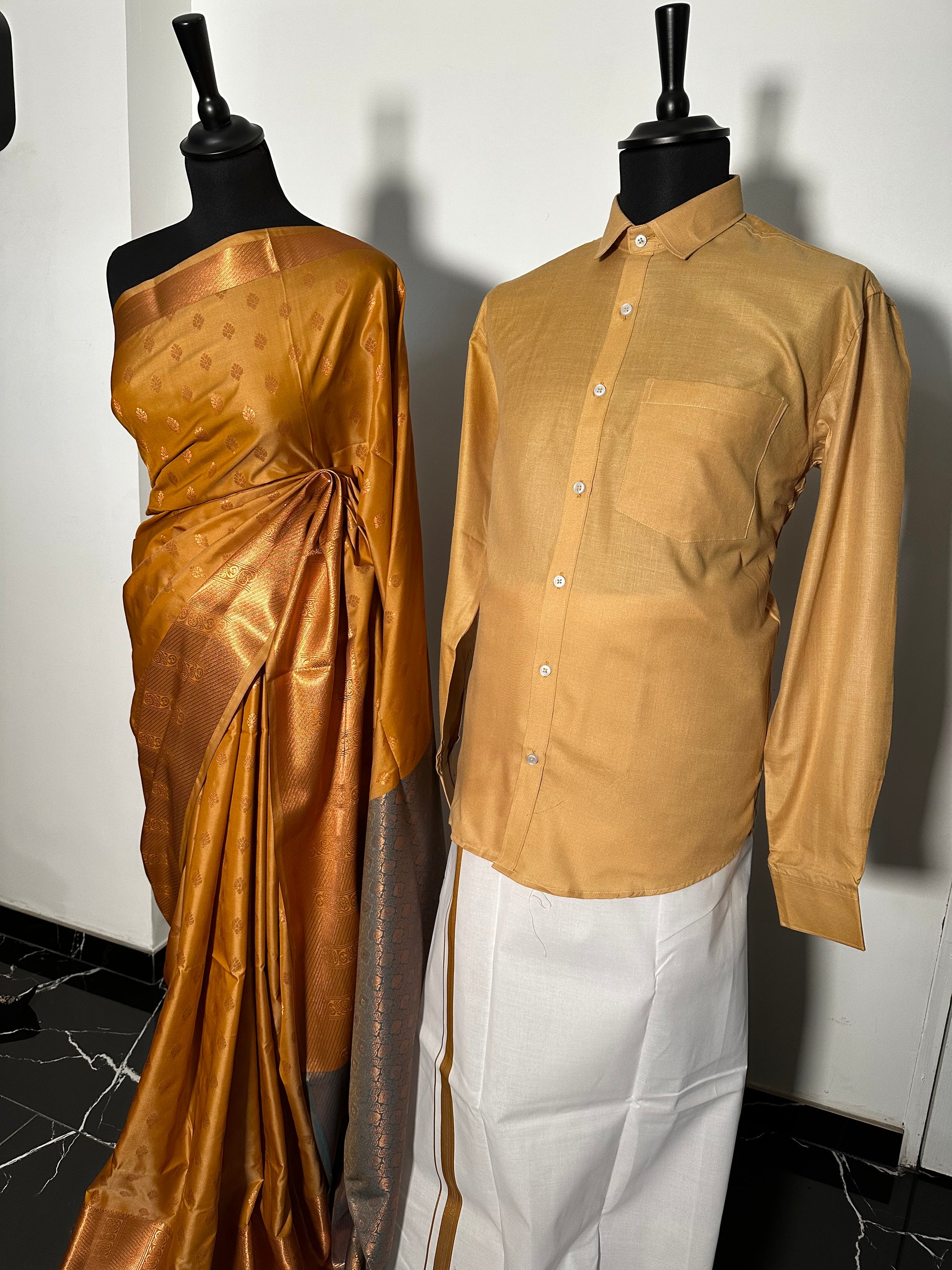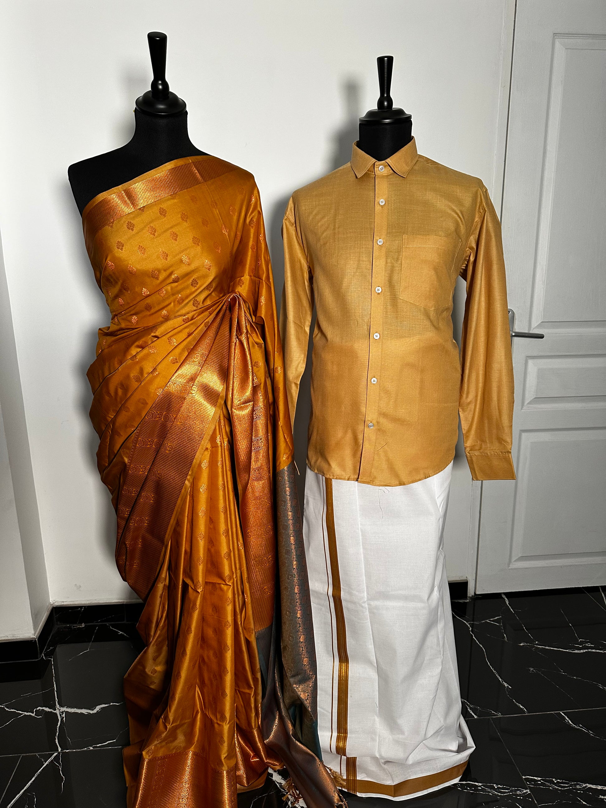 Chemise couleur doré-moutarde, confectionnée en coton lustré pour un rendu élégant et confortable. Taille : L (Large). Associée à un veshti (dhoti) blanc pur à bordure dorée parfaitement assortie à la chemise, cette tenue incarne le raffinement classique tout en soulignant la cohésion du couple.