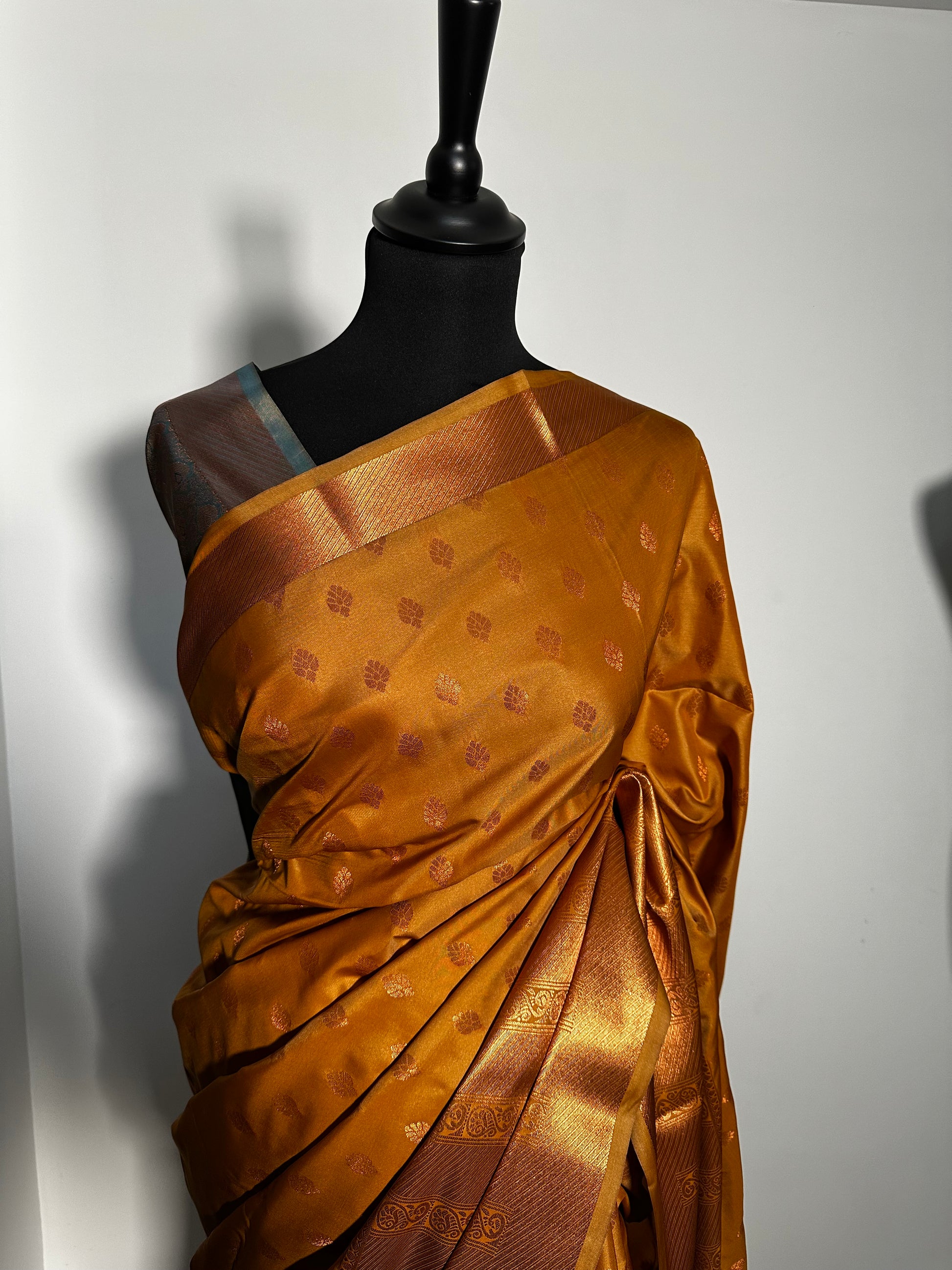 Ravissant sari en soie douce couleur or cuivré, rehaussé de délicats motifs tissés en ton sur ton et d’une bordure sombre subtilement contrastée, ornée de détails traditionnels. Ce sari évoque le luxe discret et l’élégance des grandes occasions, avec un tombé fluide et une brillance noble qui capte magnifiquement la lumière.