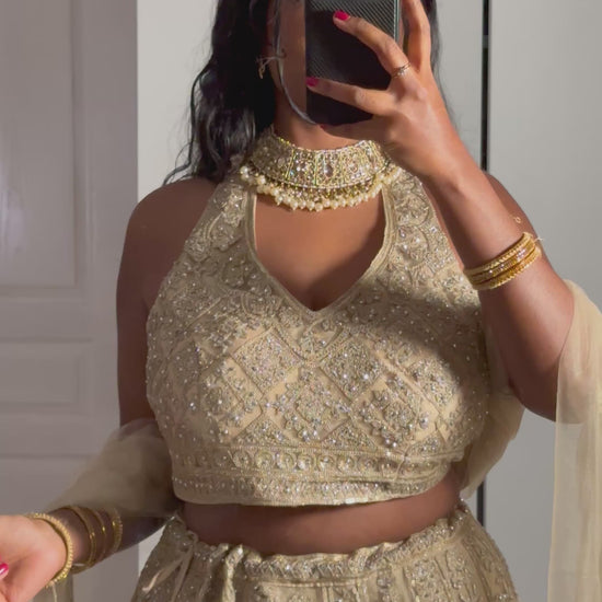 Idéal pour les mariages, fêtes et événements festifs, ce lehenga doré est un incontournable pour briller avec sophistication.