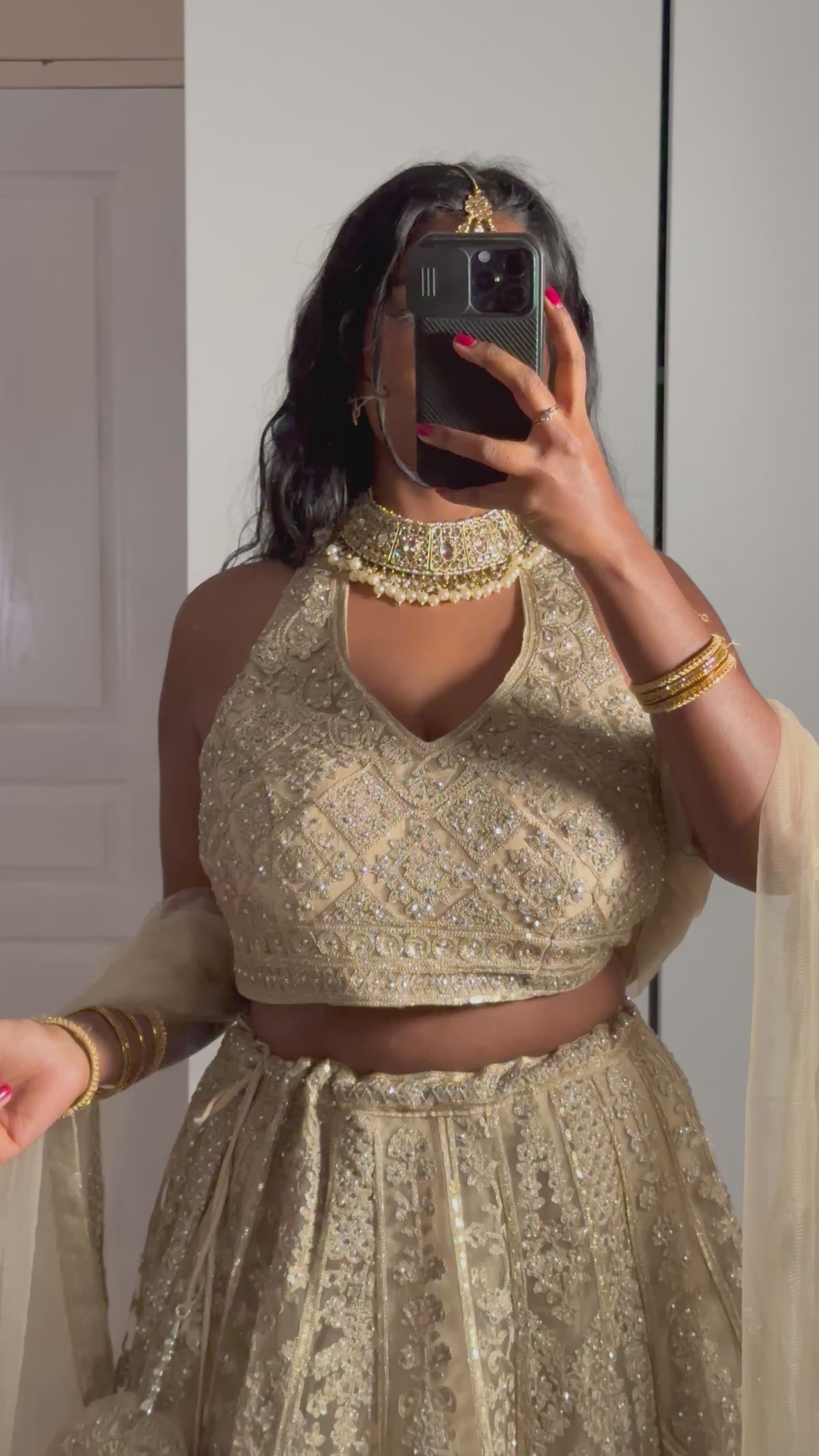 Sublimez votre look avec cet élégant lehenga doré. Confectionné dans des tissus scintillants et ornés de broderies délicates, ce lehenga incarne le glamour et l’élégance traditionnelle.