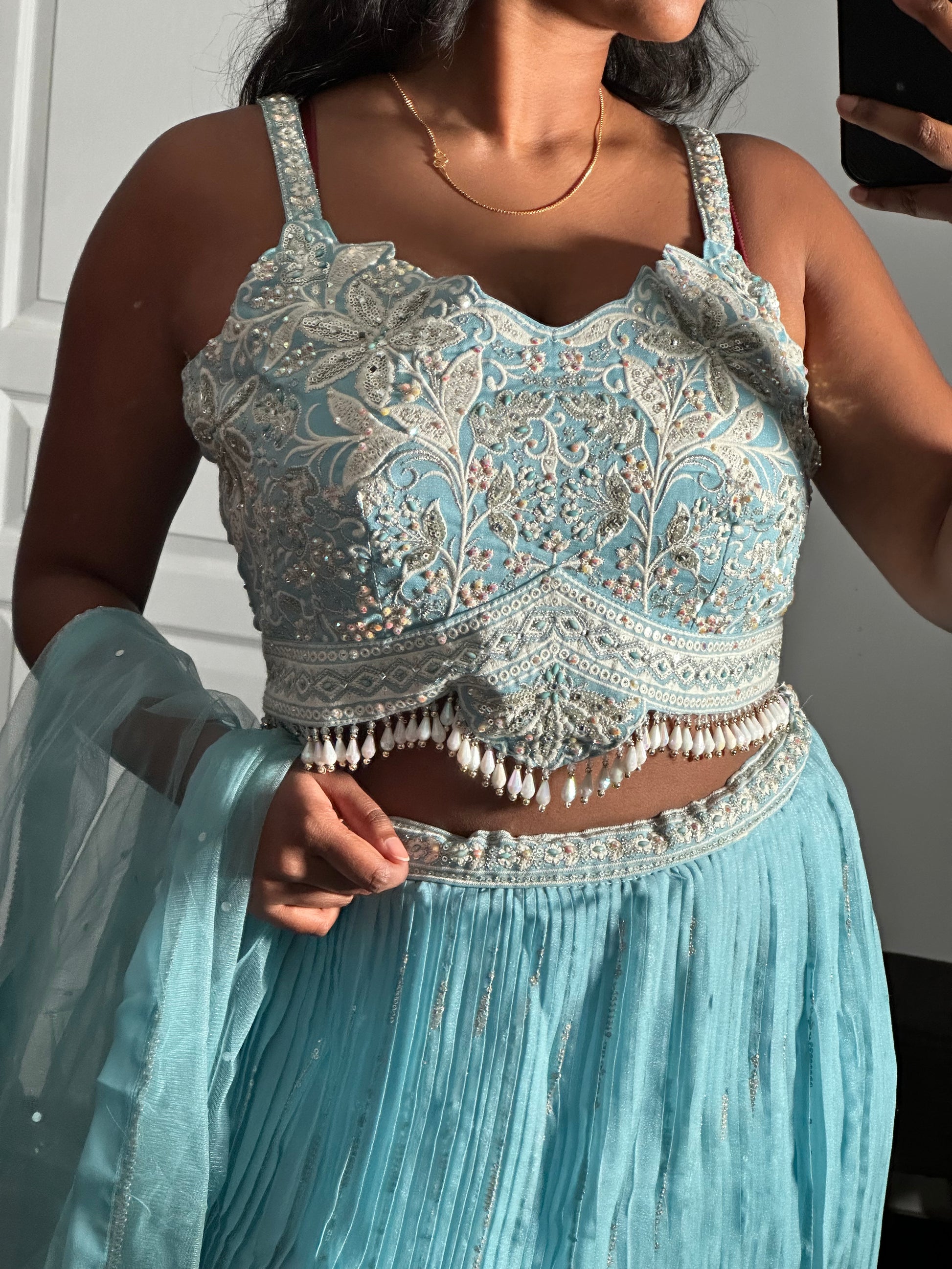 Lehenga 3 Pièces Bleu Ciel Brodé – Douceur Pastel et Détails Précieux