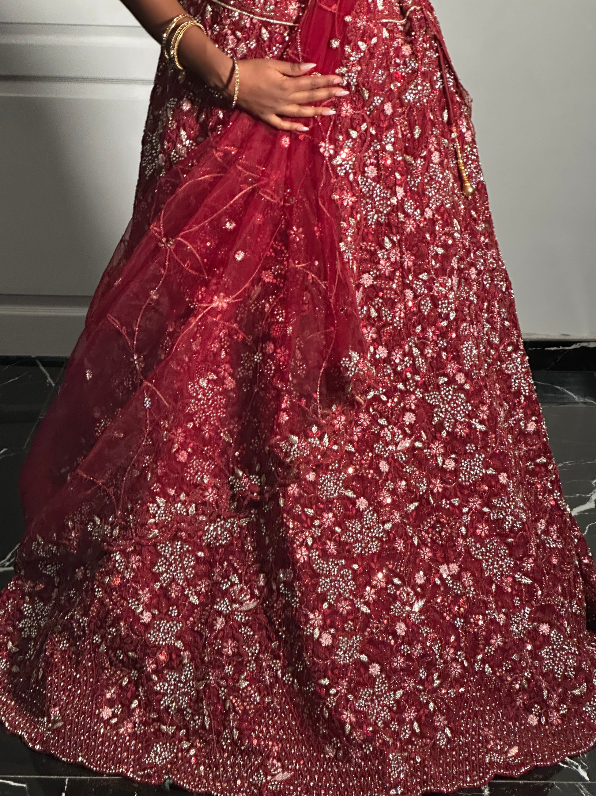 Ce somptueux lehenga bordeaux impérial allie tradition et élégance contemporaine. Sa teinte profonde, sublimée par un travail de broderie dorée d’une finesse exceptionnelle, en fait une pièce d’apparat idéale pour les cérémonies de mariage, réceptions ou soirées de prestige.