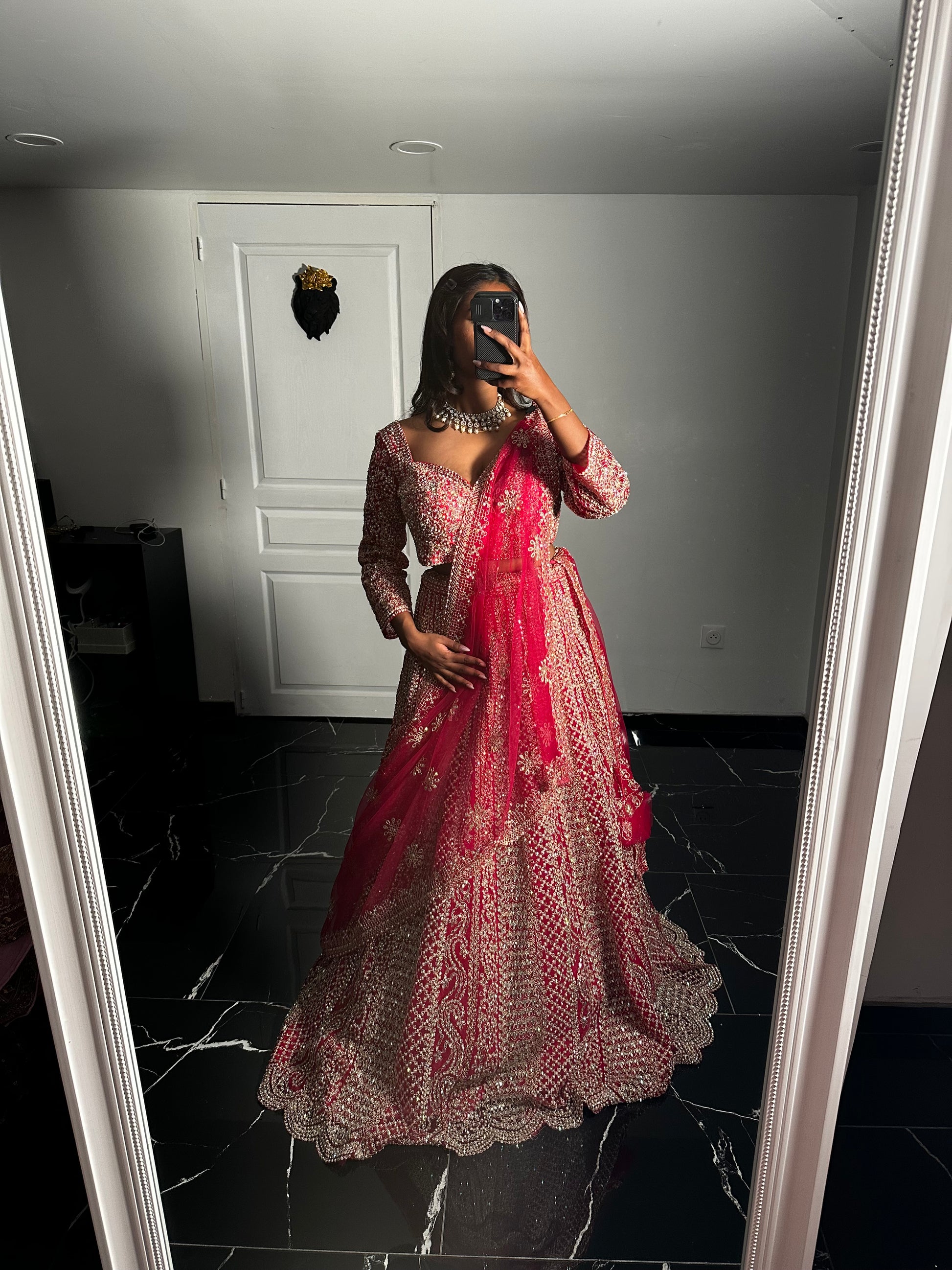 L’ensemble se compose de trois pièces : choli (haut brodé), lehenga (jupe volumineuse) et dupatta (voile coordonné), confectionnés dans des tissus nobles pour un rendu éclatant et raffiné.