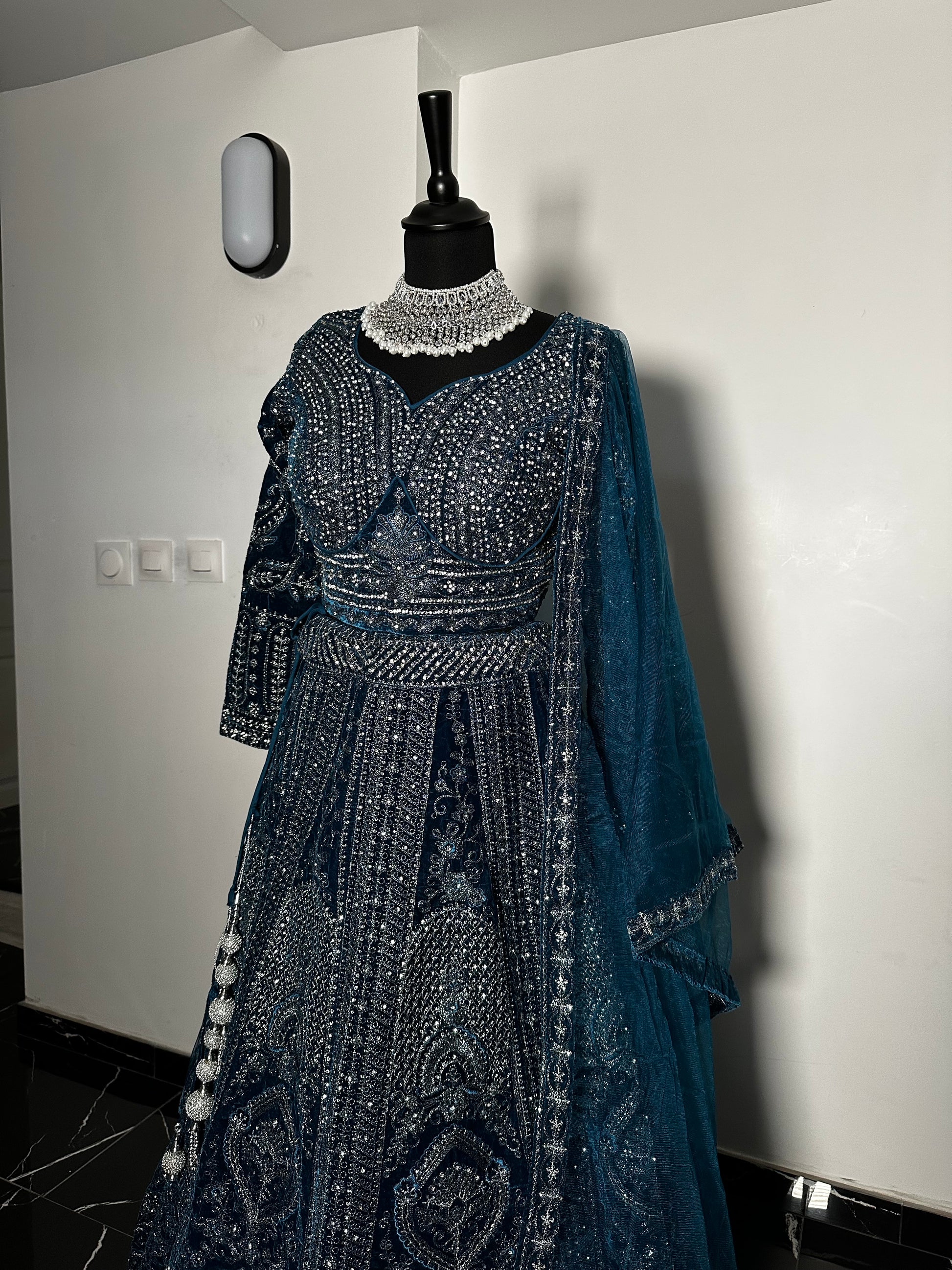 Lehenga Royal en Velours Bleu Paon Nuit – Broderie Argentée Haute Couture