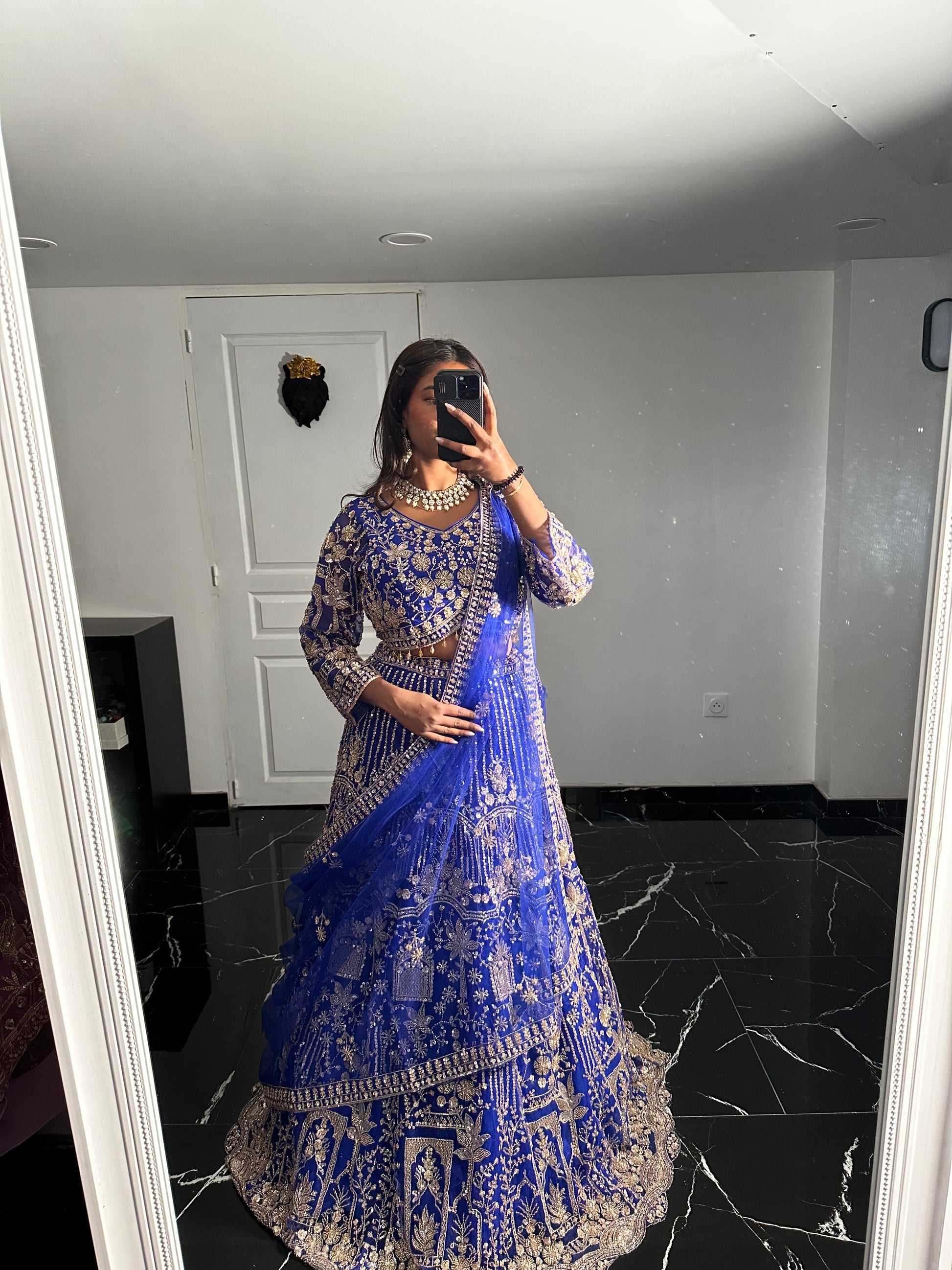 Ce somptueux lehenga 3 pièces se distingue par sa teinte bleu roi et ses broderies dorées luxueuses, minutieusement réalisées à la main. Conçu pour incarner la grandeur des cérémonies traditionnelles tout en conservant une ligne contemporaine, ce modèle associe, tulle délicat et fils métalliques précieux.