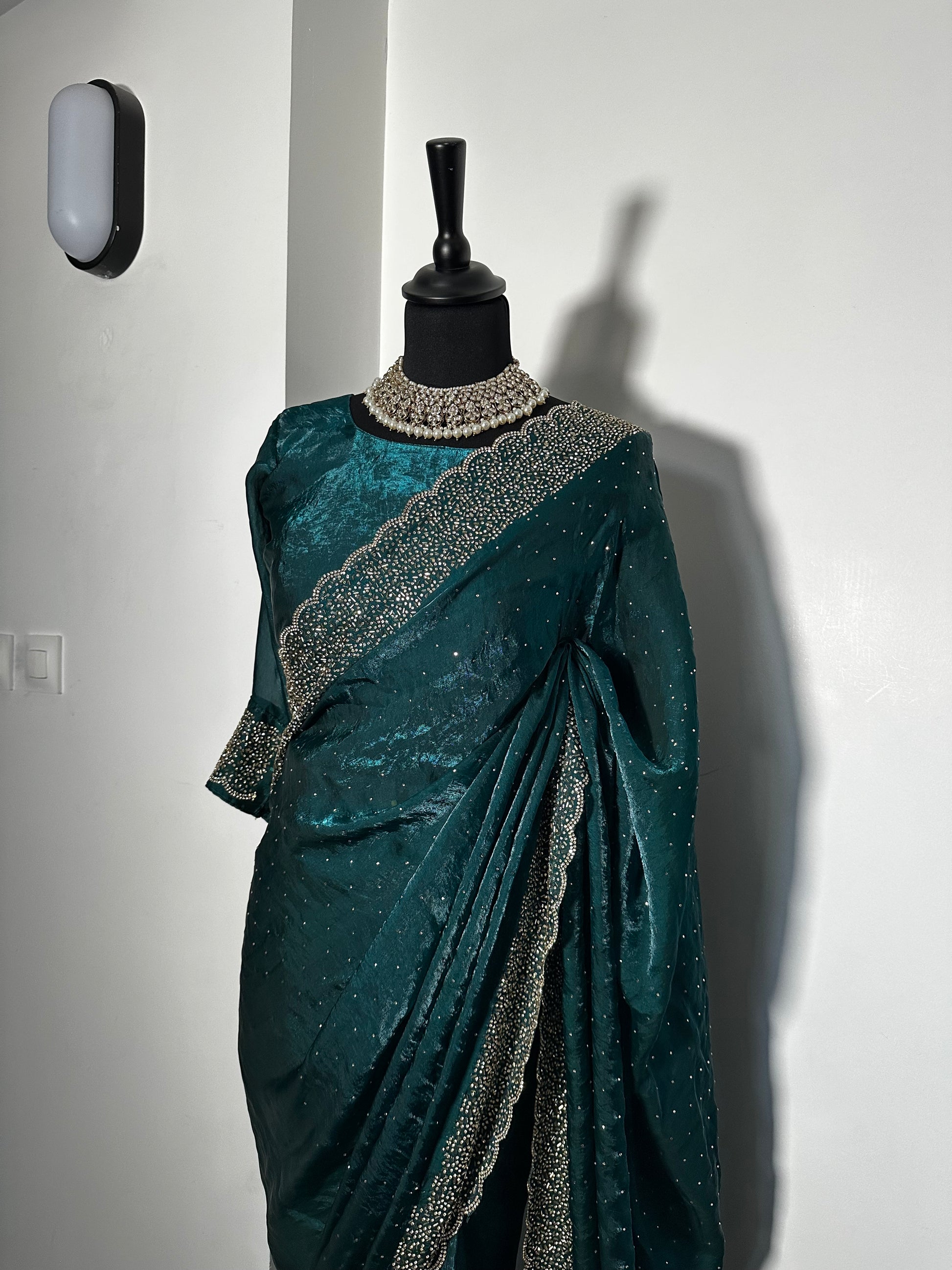 Présentant notre collection de saris la plus raffinée, ce chef-d’œuvre est confectionné dans un tissu space silk luxueux, qui allie fluidité, légèreté et éclat naturel. L’ensemble est sublimé par un travail de jarkhan méticuleux, avec des perles et des motifs scintillants qui ajoutent une touche royale à chaque mouvement.