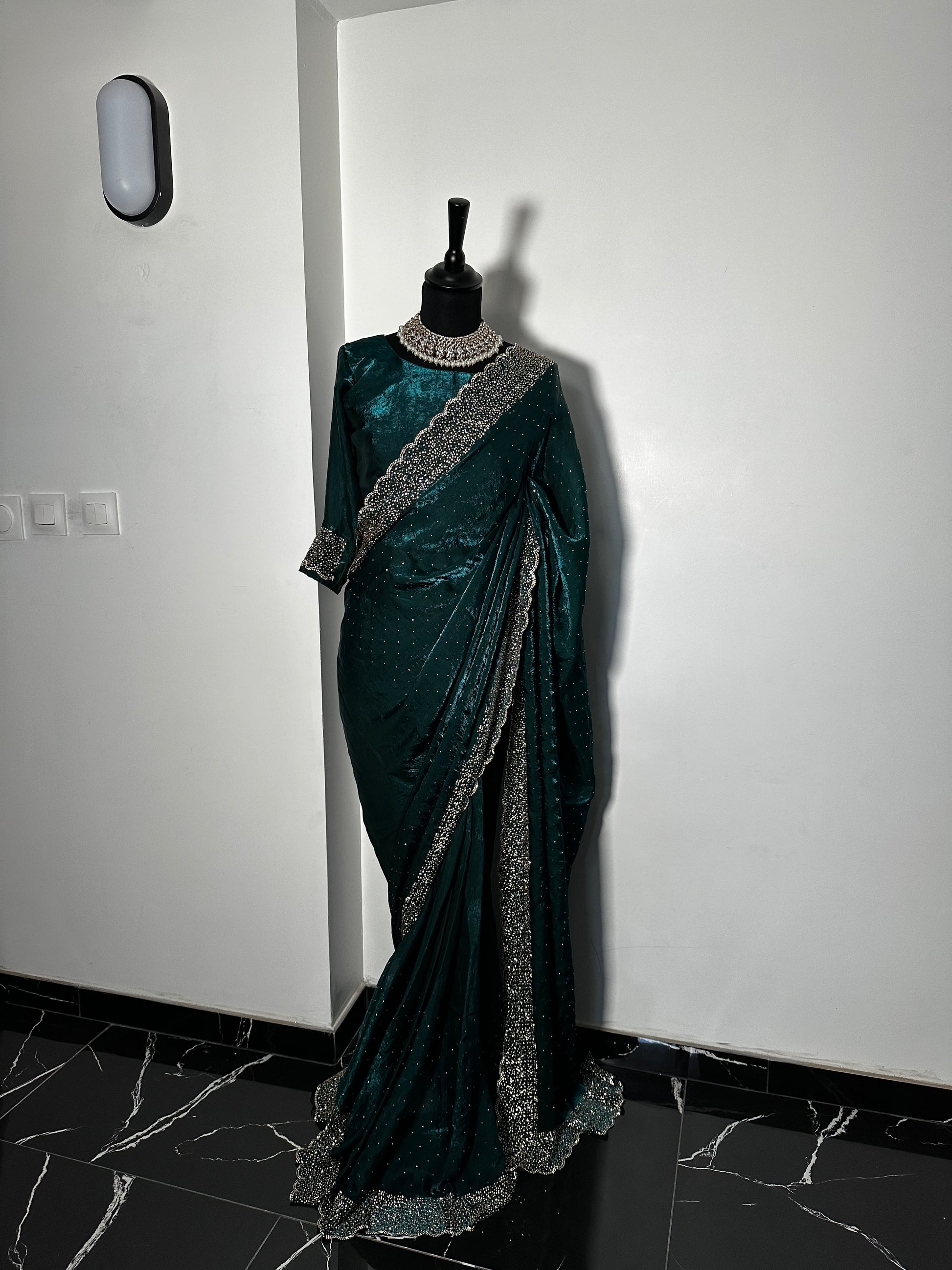 Découvrez l’élégance intemporelle avec notre somptueux sari à manches longues, orné de perles étincelantes.