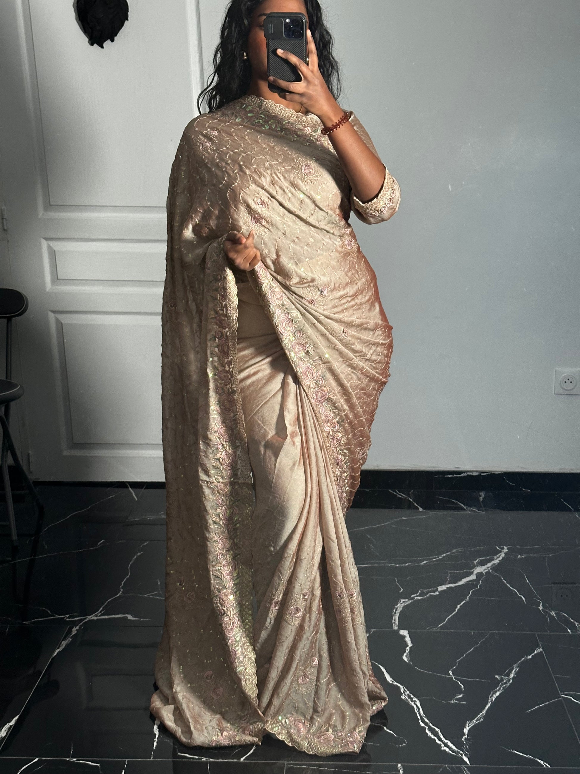 - Détails : Broderies “Italian Diamond Work” sur l’ensemble du sari
