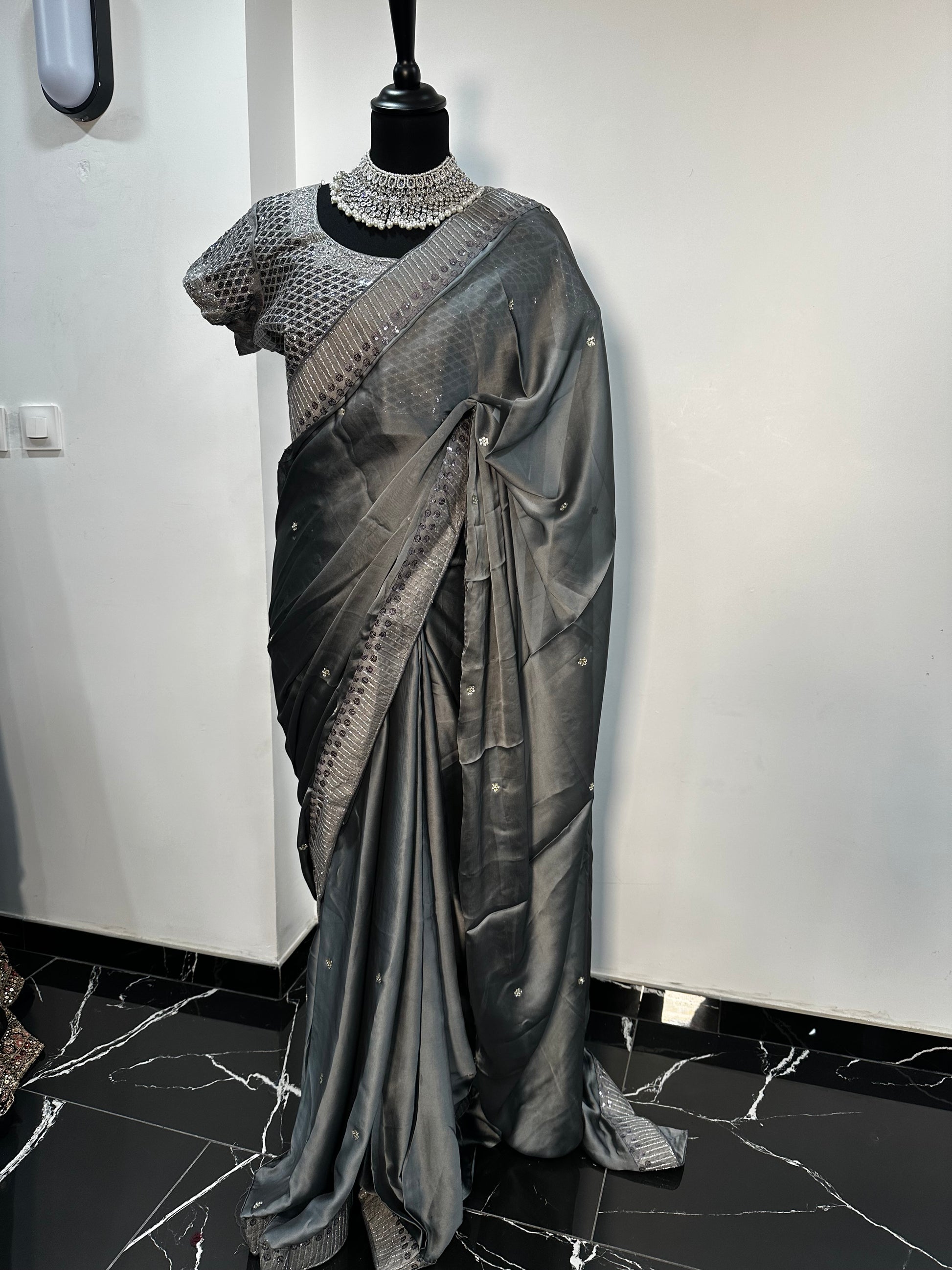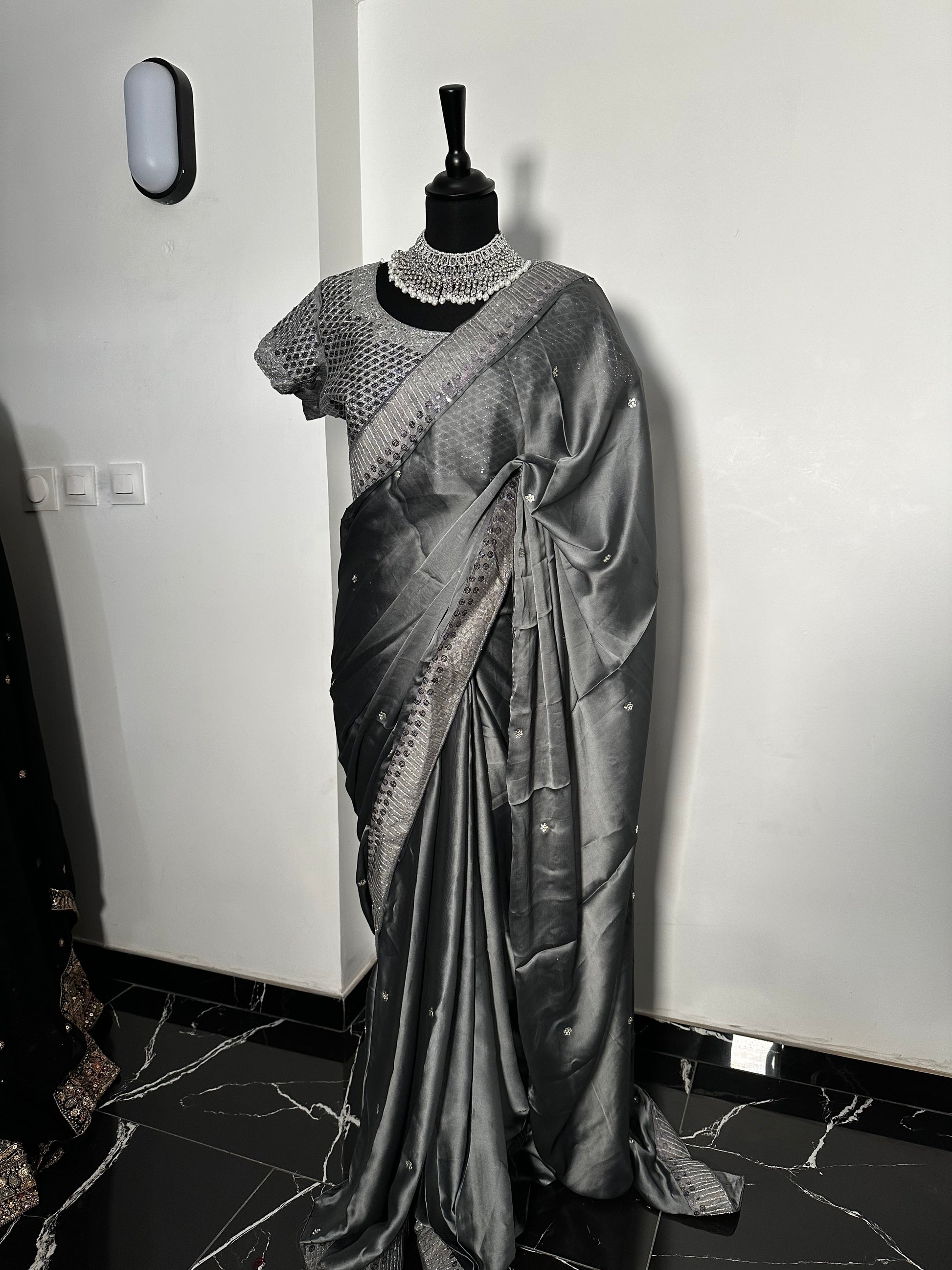 One minute Saree Gris Satinée avec Blouse Brodée – Élégance Contemporaine