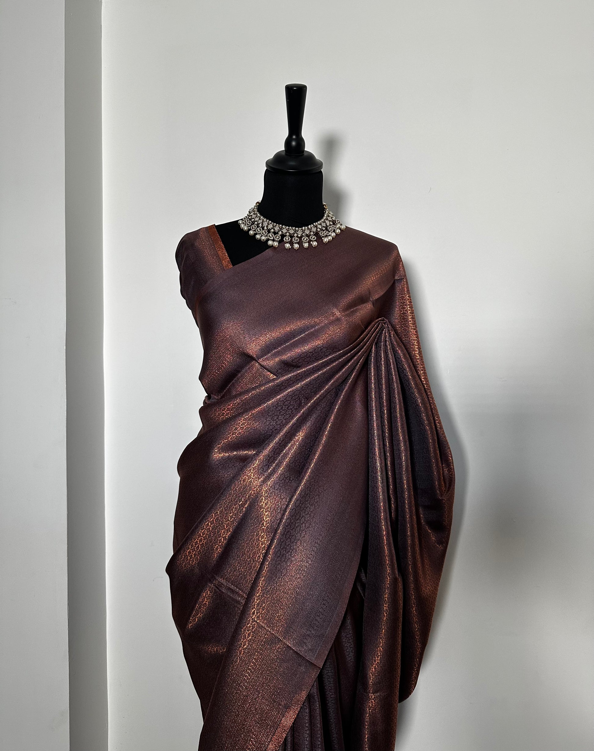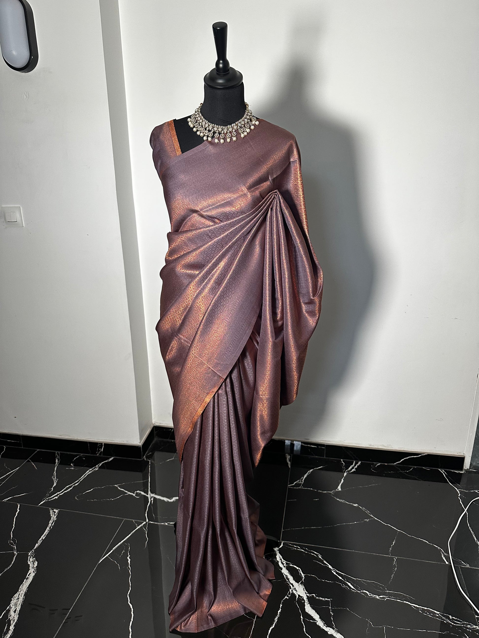Ce sari en Kubera Pattu allie raffinement traditionnel et modernité textile. Il est idéal pour les femmes recherchant une étoffe prestigieuse au tombé fluide, facile à draper et d’un rendu visuel somptueux, tout en restant léger et confortable.