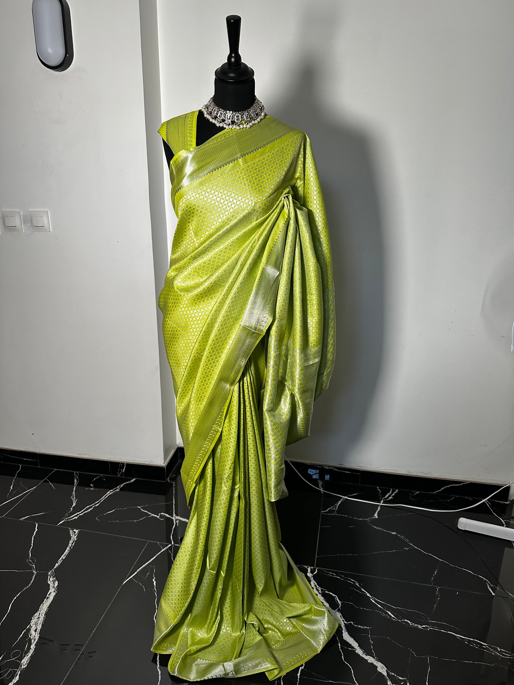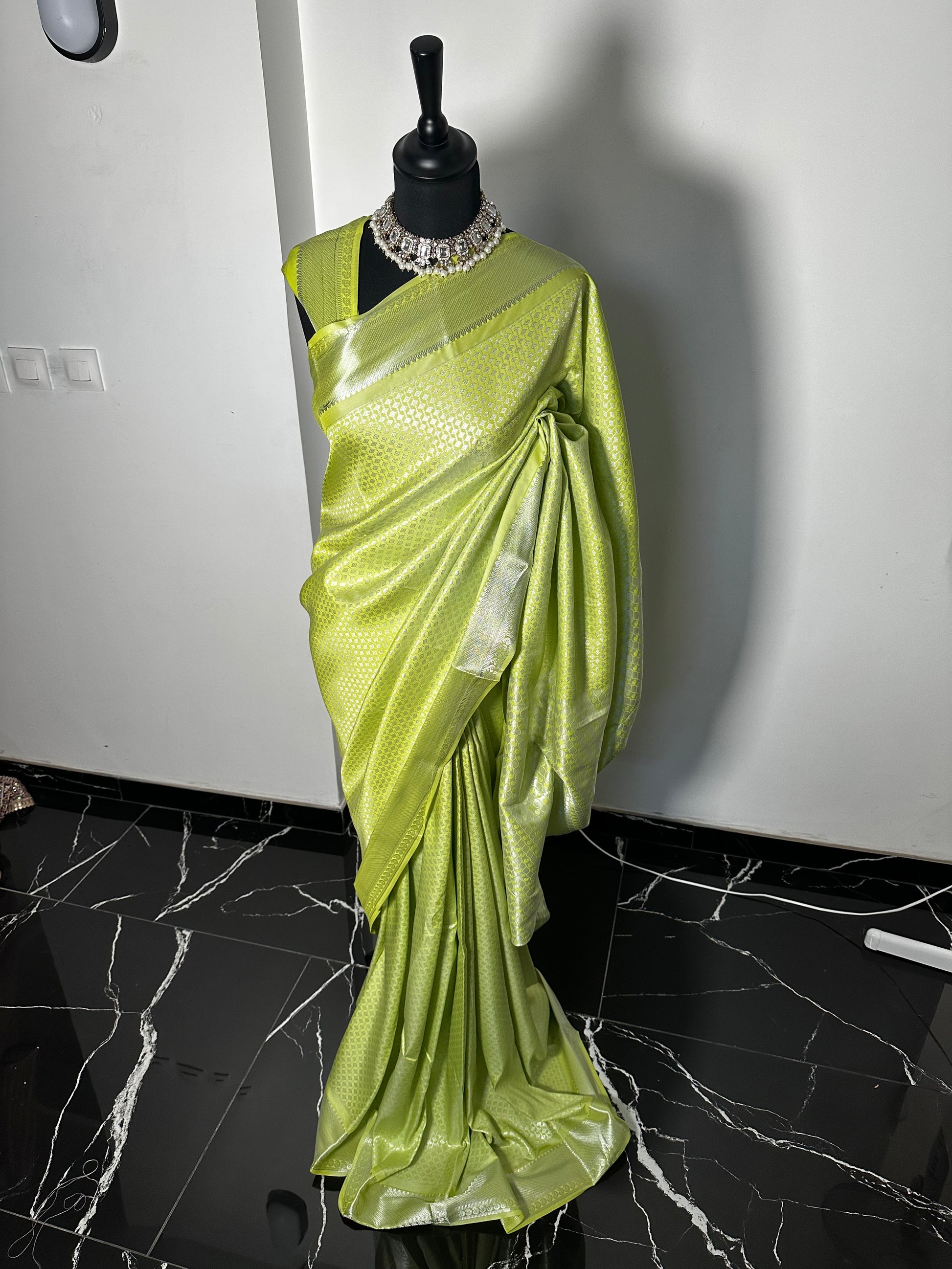 Ce saree est une pièce lumineuse et audacieuse, tissée dans un Art Silk Banarasi souple à la brillance éclatante. Avec sa teinte vert chartreuse vibrante et son tissage zari argenté raffiné, ce sari incarne l’alliance parfaite entre modernité et tradition.